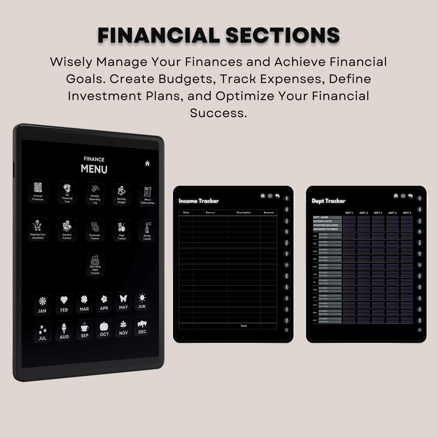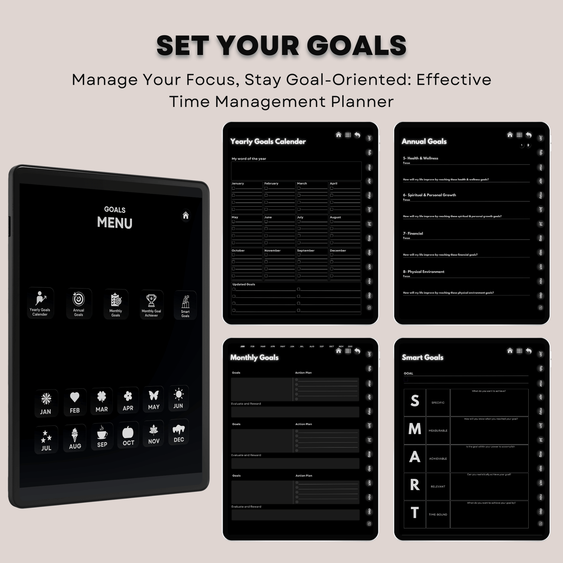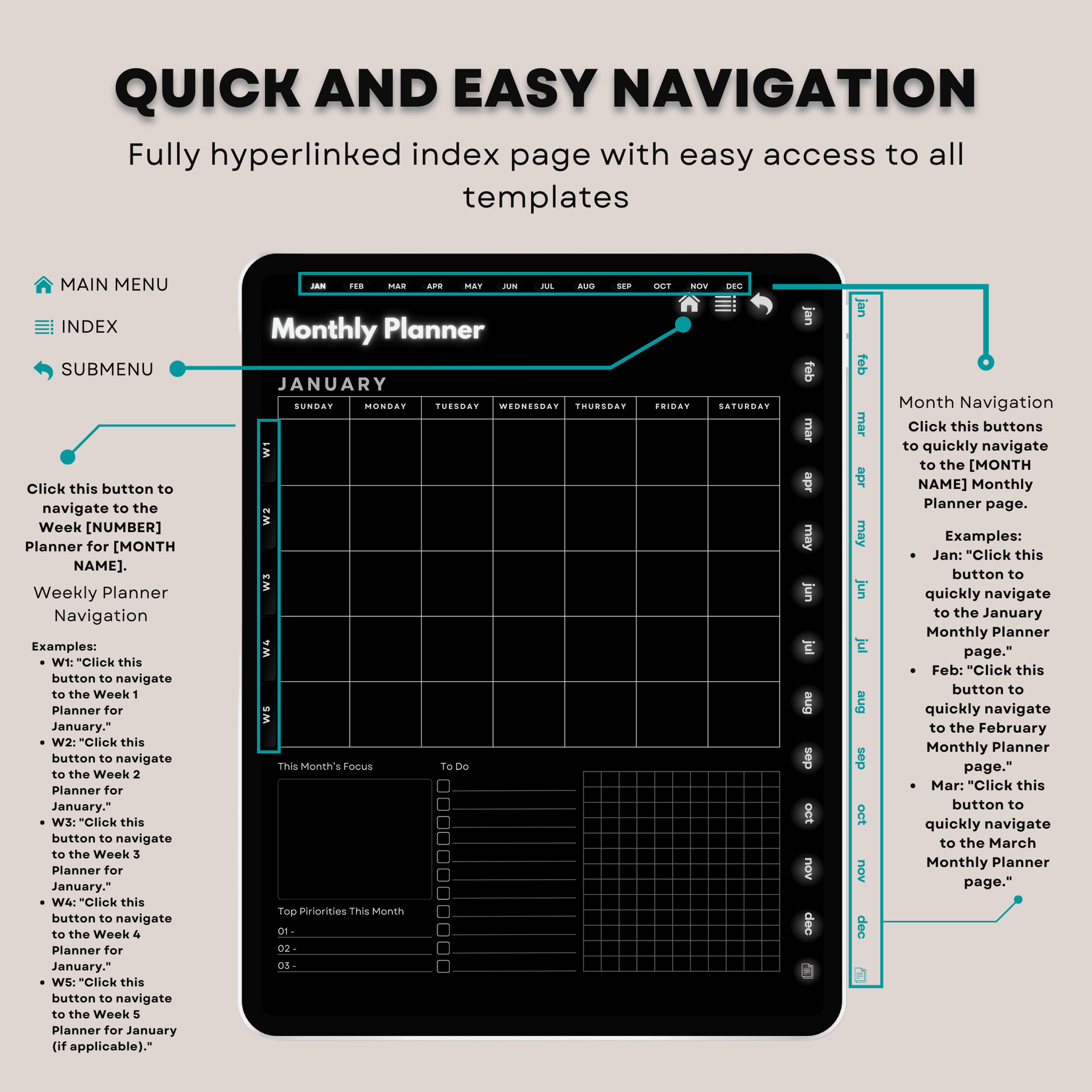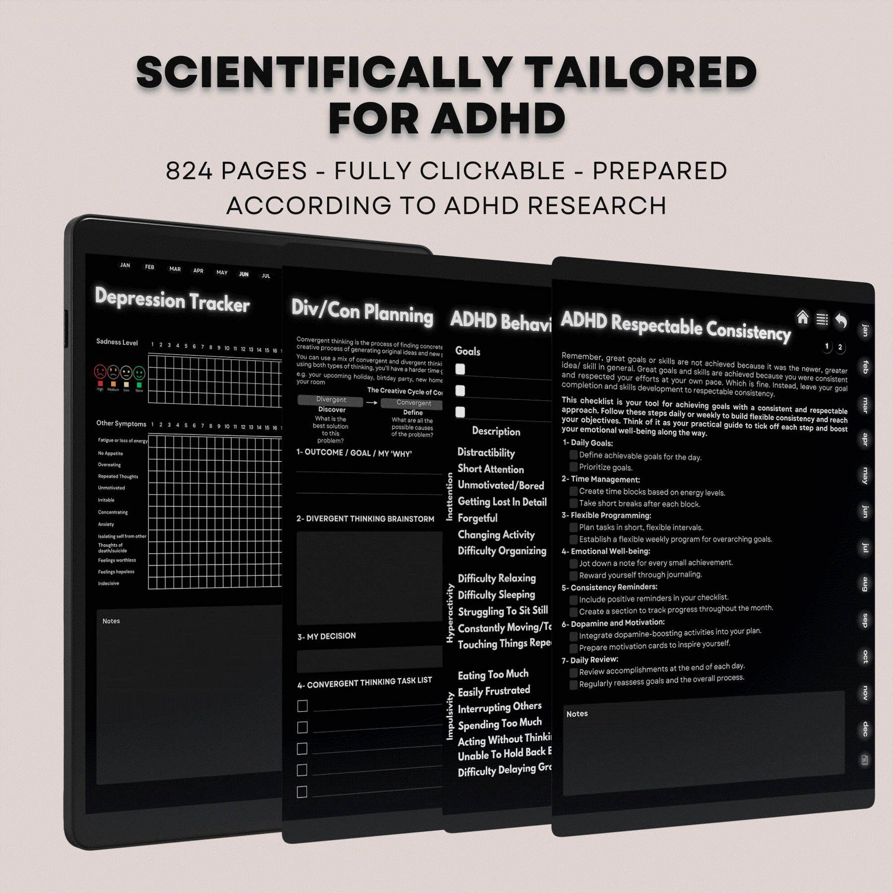 Planificador digital premium para TDAH con hipervínculos y actualizado en modo oscuro para iPad y Android. Diseños diarios, semanales, mensuales y anuales. Descarga instantánea.