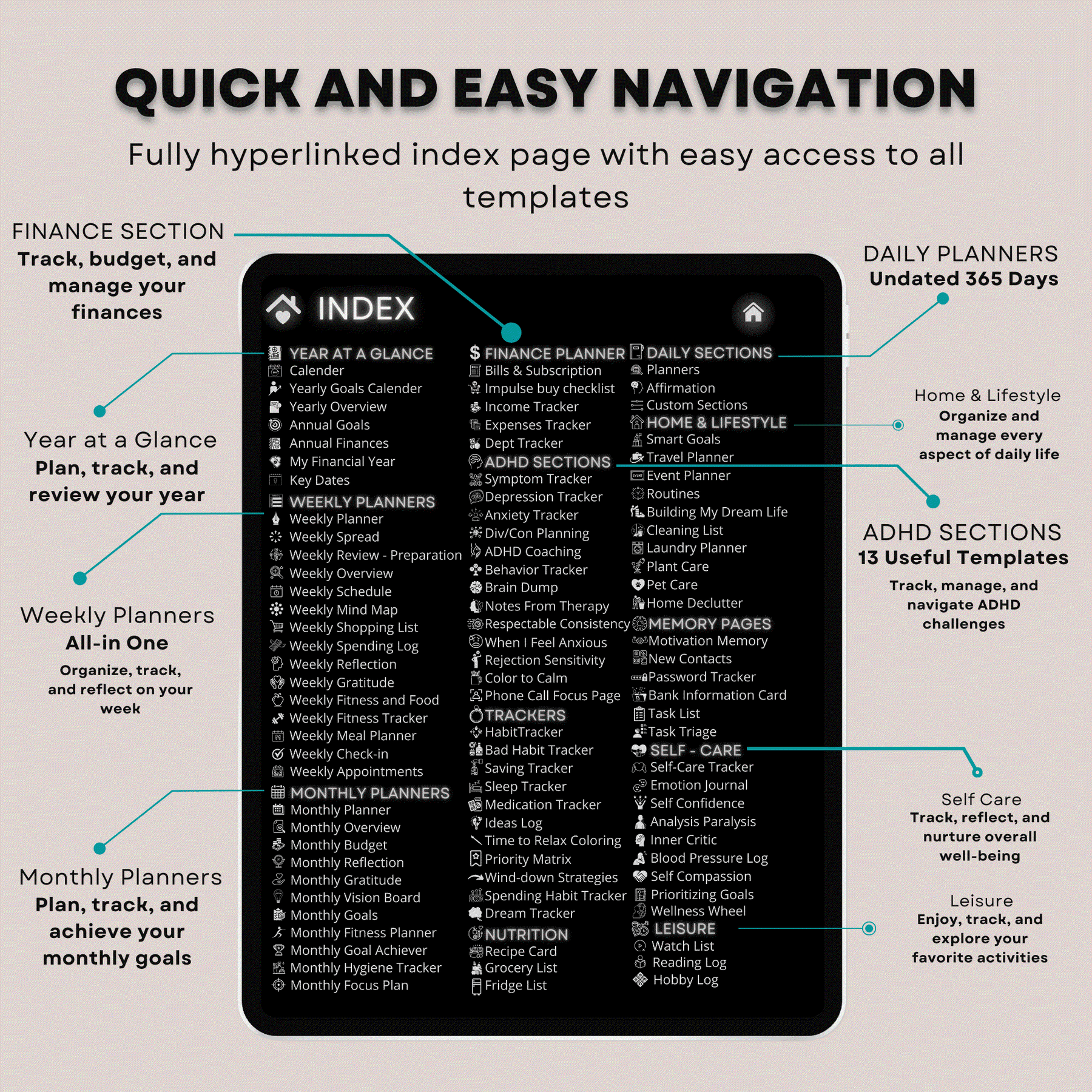 The ADHD Planner: Find Your Focus with Dark Mode & Hyperlinked Design