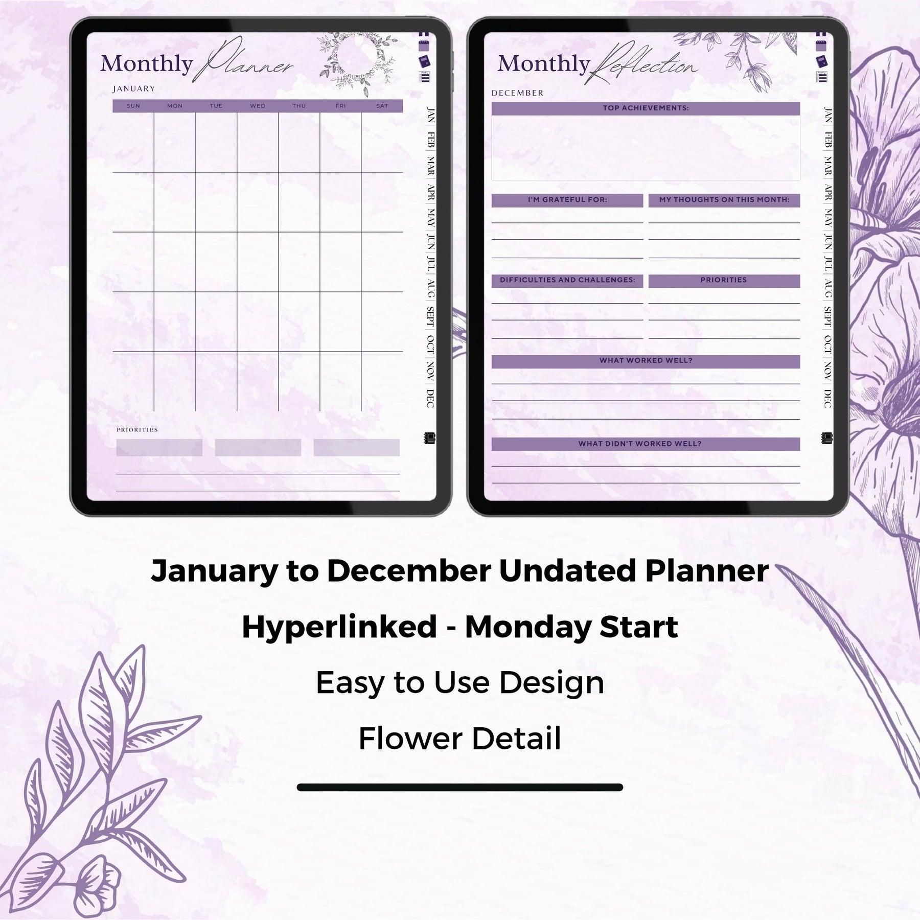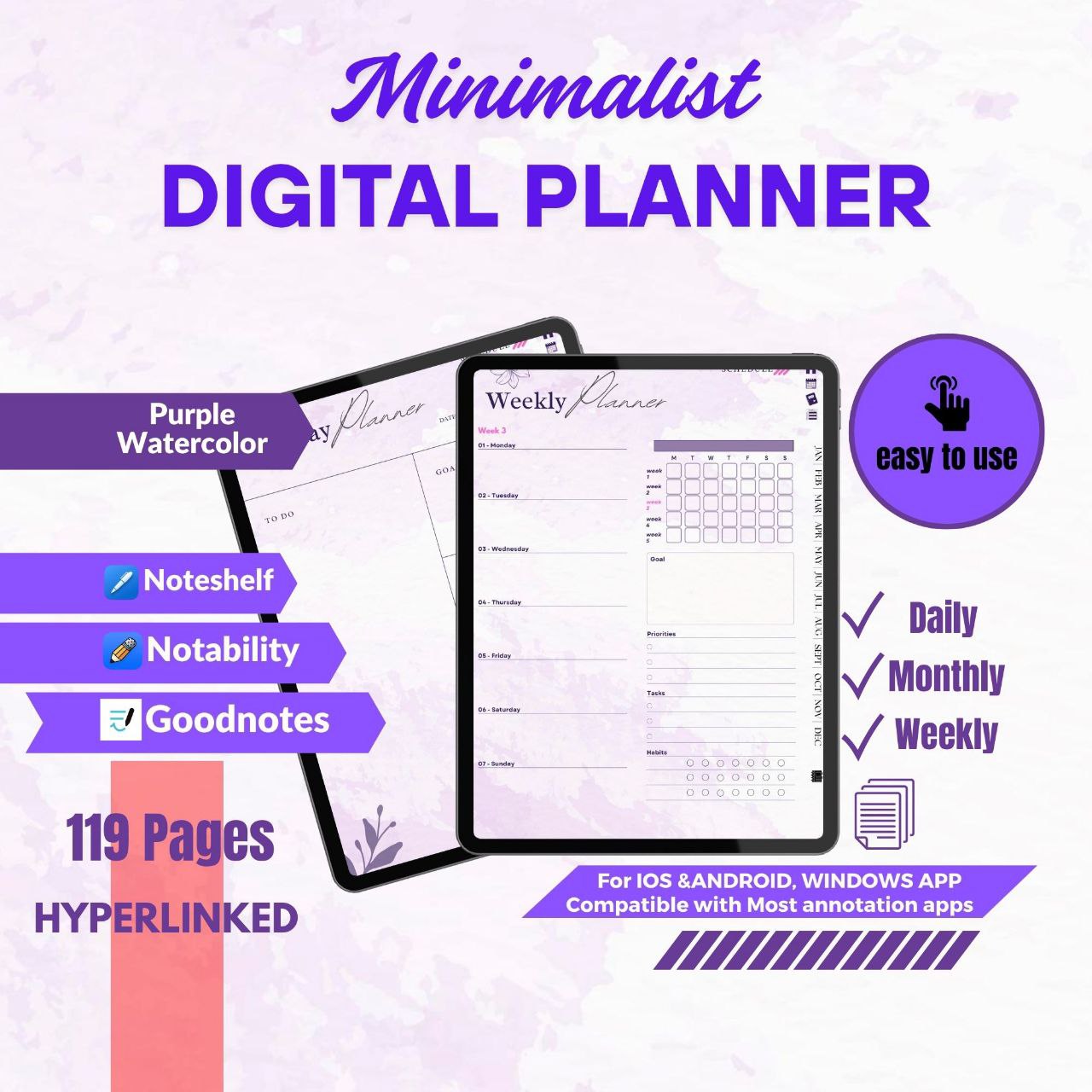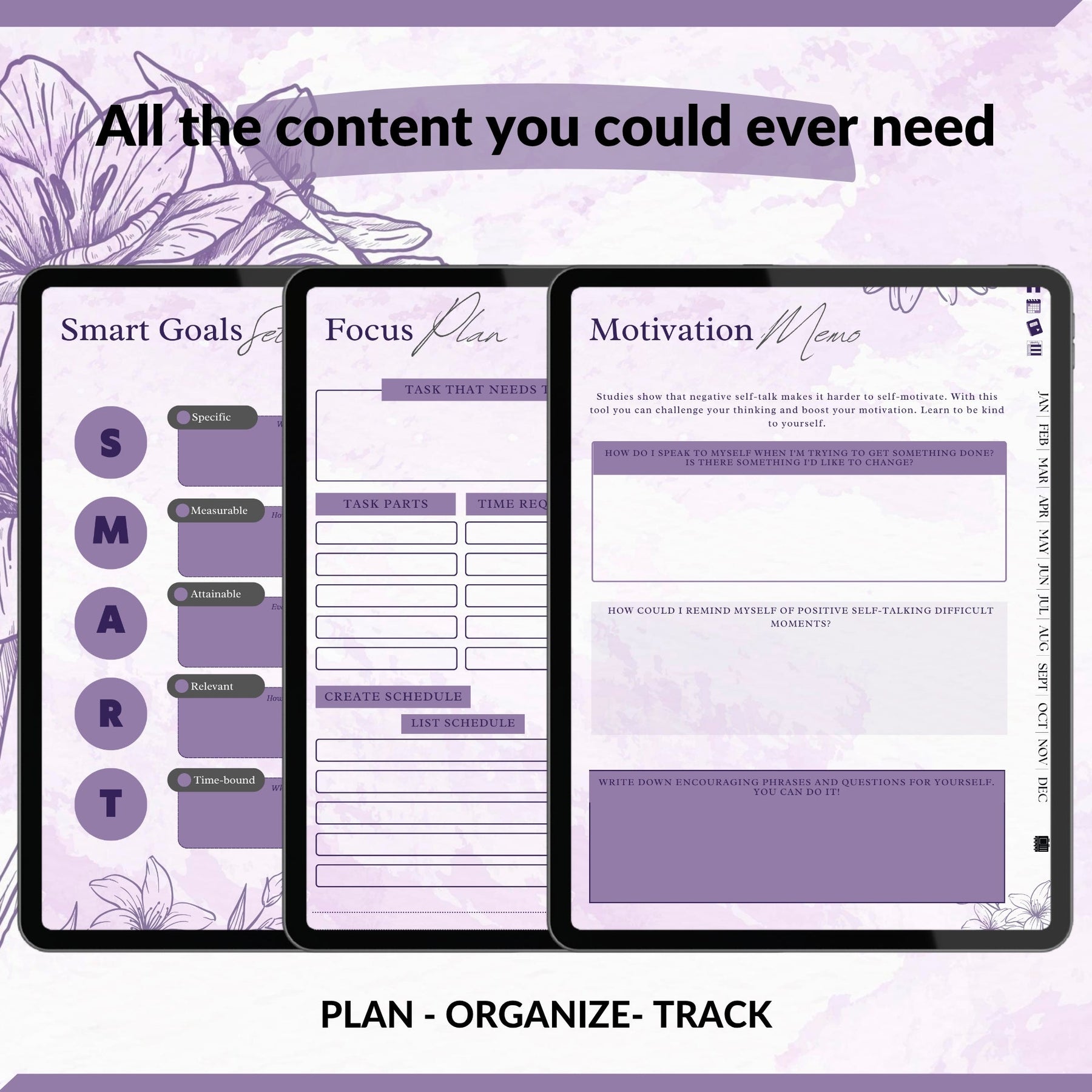 Planificador digital para TDAH para iPad y Android | Modo Morado | Organizador de productividad y concentración sin fecha y con hipervínculos | Diseños diarios, mensuales y anuales